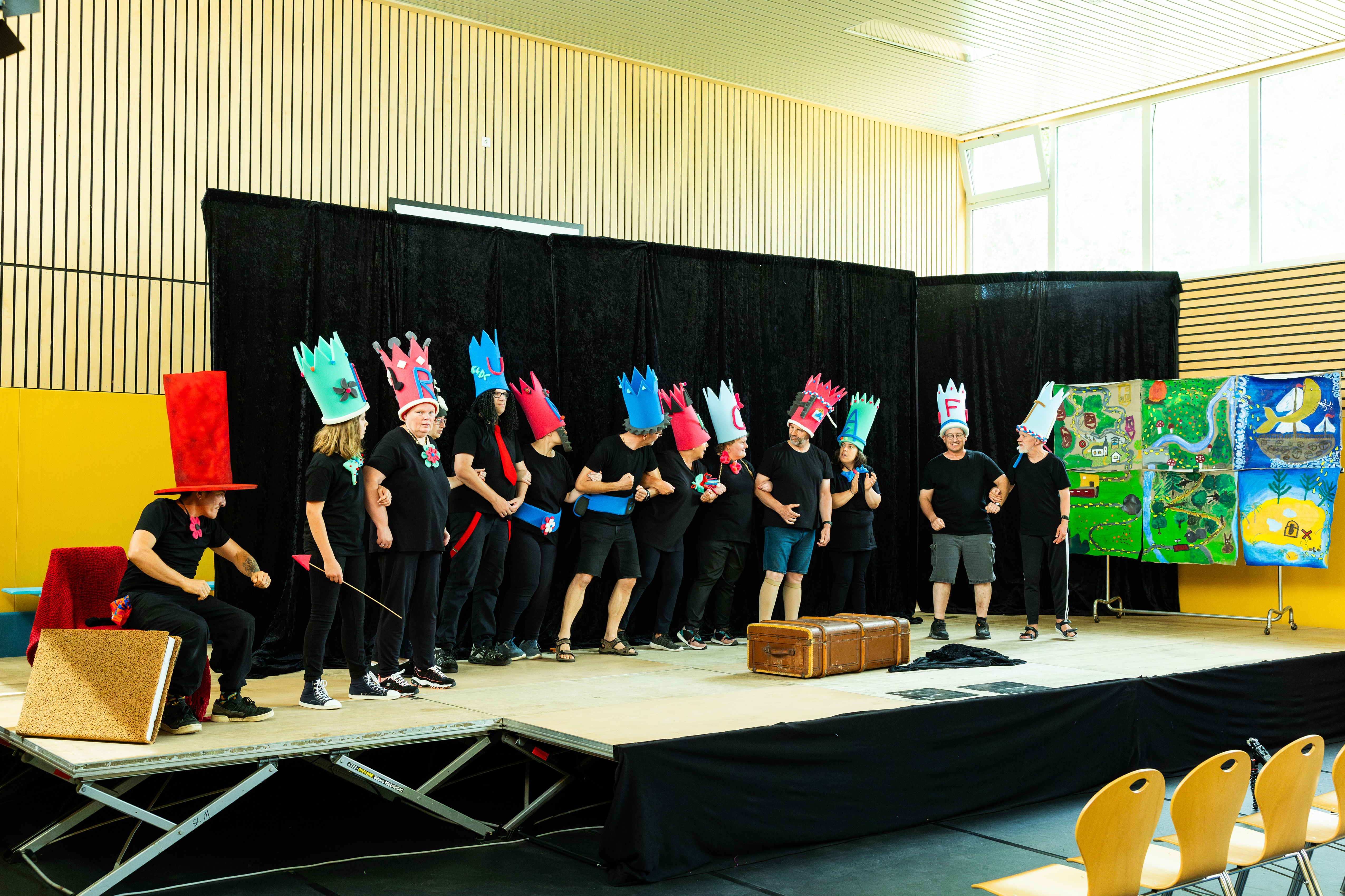 Seit inzwischen zehn Jahren kooperiert die JUKUSCH Jugendkunstschule Cochem-Zell mit dem Bildungs-und Pflegeheim St. Martin Düngenheim-Ulmen-Kaisersesch beim inklusiven Malprojekt »Unbehindert Kreativ«. Dieses Jahr kam es erstmalig zu einem inklusiven Theaterprojekt. Mit der Unterstützung von »Aktion Mensch« konnte das Projekt im Juni beginnen. Insgesamt acht Bewohner und Bewohnerinnen aus St. Martin und fünf theaterinteressierte Menschen aus der Region trafen sich jeden Freitag, um sich auf der Bühne auszuprobieren. Gemeinsam wurden dann die Geschichte des Stücks ausgedacht, die Rollen festgelegt und die Kostüme gestaltet sowie geübt, geprobt und gespielt.