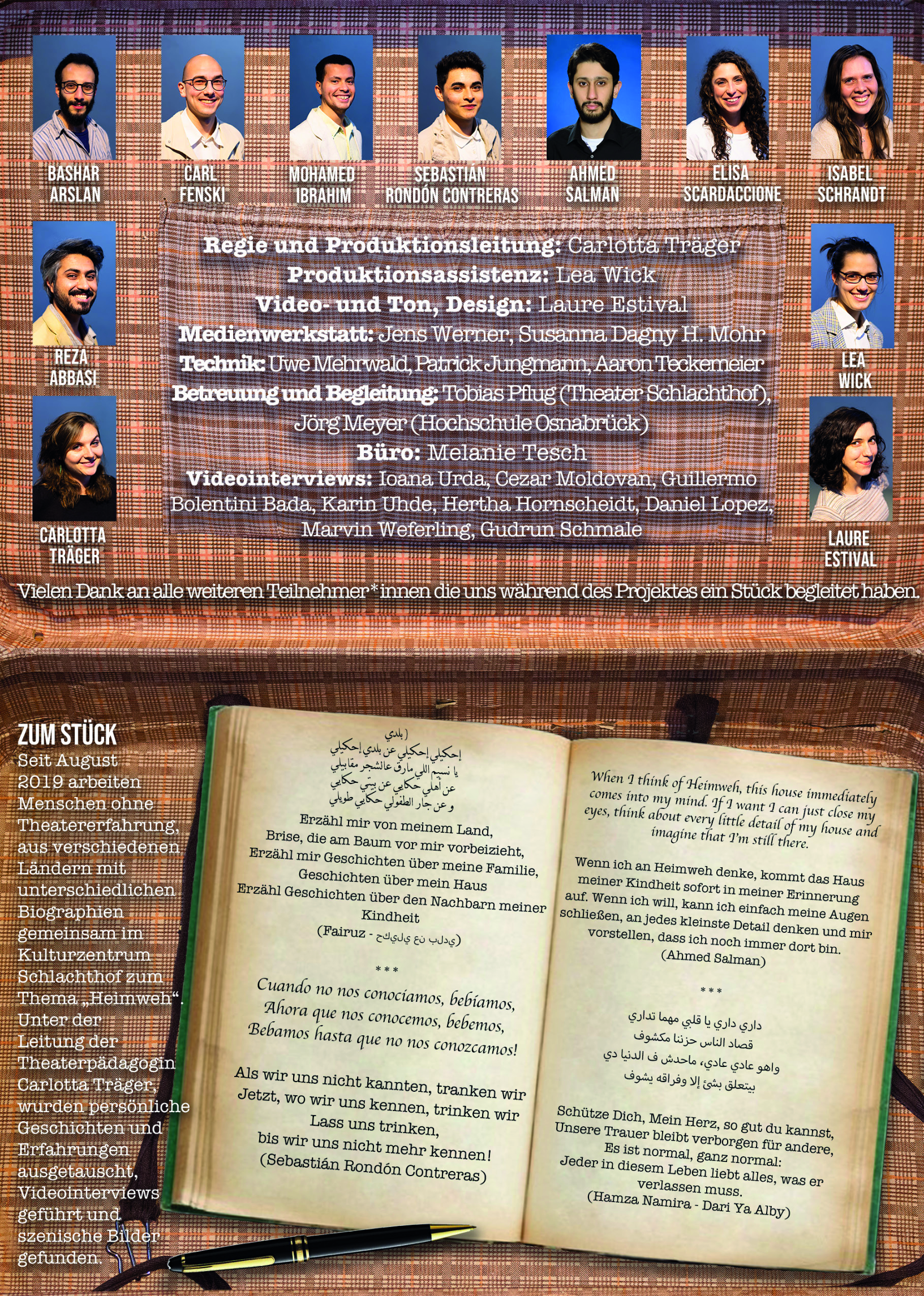 Gemeinsam arbeiteten von August 2019 bis Januar 2020 Menschen aus verschiedenen Ländern mit unterschiedlichen Biographien im Kulturzentrum Schlachthof zum Thema „Heimweh“. Unter der Leitung der Theaterpädagogin Carlotta Träger werden persönliche Geschichten und Erfahrungen ausgetauscht und szenische Bilder dafür gefunden. Typische Gerichte und Gerüche beschrieben, Lieder, die in Verbindung zum eigenen Heimweh stehen gehört und, sofern es welche gibt, besondere Objekte aus der Heimat gezeigt und ihre Bedeutung offenbart.