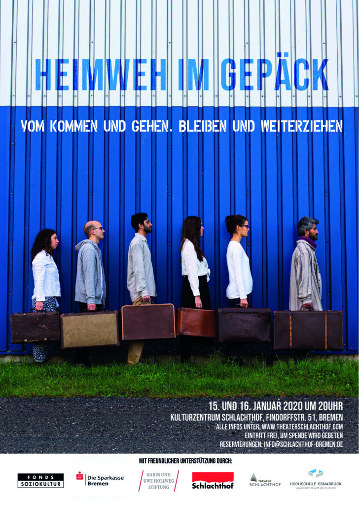 „Heimweh im Gepäck“ wurde freundlich unterstützt durch den Fonds Soziokultur, die Sparkasse Bremen, die Hollweg Stiftung und dem Kulturzentrum Schlachthof. Das Projekt fand in Kooperation mit dem theaterSCHLACHTHOF statt.
